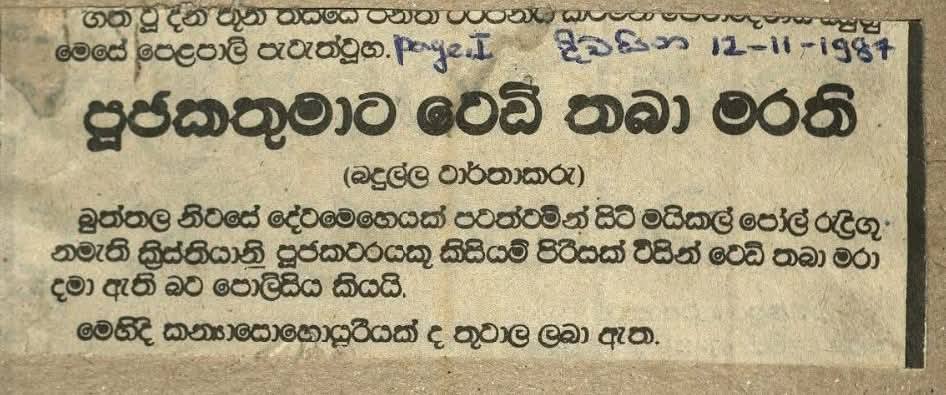 මීට හරියටම වසර 38 කට පෙර අද වැනි දිනක (1987.11.10) බුත්තල වැසියන්ට අසන්නට ලැබුණේ හද කම්පා කරවන පණිවුඩයක්. බුත්තල වැසියන් ආගම් භේදයකින් තොරව ආදරය කළ මයිකල් පියතුමා වෙඩිතබා ඝාතනය කර තිබුණා. එතුමන් මෙලෙස තම ජීවිතය පූජා කරන්නේ අසරණ ජනතාව අතහැර යන්නට, එතුමාට එල්ල වූ තර්ජන හමුවේ ඔවුන් කිසිදා අත්නොහරින්නට එතුමාණන් ගත් අභීත තීරණය නිසයි.